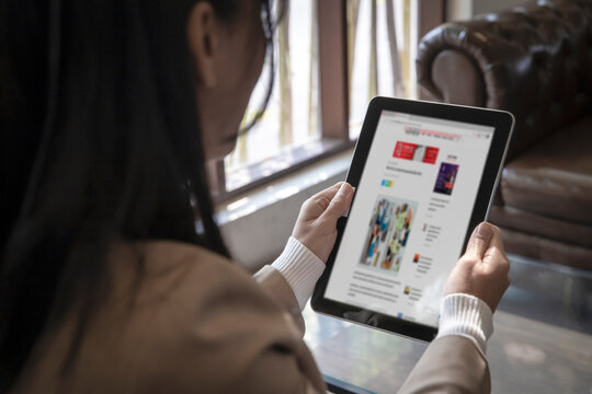 Closeup businesswoman reading news fashion or articles on website on the screen in smart taplet , internet networking concept