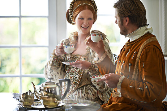 King, queen and couple with tea at castle, smile and conversation in vintage clothes for royalty at breakfast. Woman, man and drink together in morning with Victorian fashion at regal palace in UK