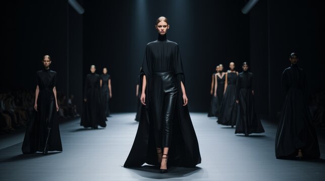 Beautiful tall female models wearing black designer outfits walk down the catwalk during a minimalistic fashion show of a new collection of clothes at the Fashion Week.