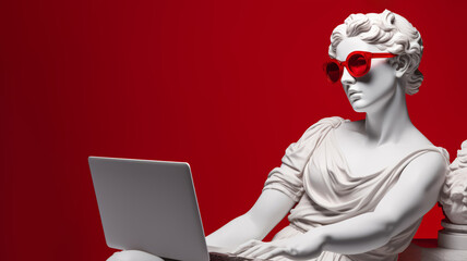 Bright red sunglasses on a classic white marble Venus statue, a playful blend of ancient art and modern flair on a vibrant red background. Copy space