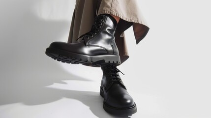 Person in black boots on white background. Low angle fashion photography style. Fashionable black shoes. The trendy black footwear adds a fashionable flair to the ensemble