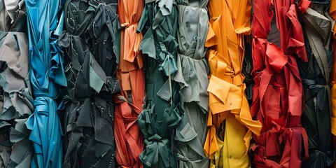 Colorful clothing scraps in a waste sorting facility showcasing the impact of fashion waste. Concept Fashion Waste, Clothing Scraps, Waste Sorting Facility, Impact of Fashion Waste, Colorful Clothing