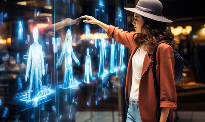 Happy plus-size woman choosing clothes in a fashion boutique. Body positivity, shopping, and self-love concept. Scene for inclusive fashion brands and retail store promotions