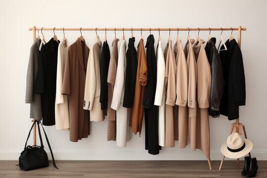 Autumn stylish modern women's neutral color capsule wardrobe with different sweaters on light grey background. Building stylish wardrobe, Seasonal capsule easy dressing, order in things concept.