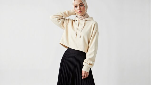 Young Female Model Showcasing a Stylish Outfit Featuring a Cropped Sweatshirt and Pleated Skirt, Embracing Modern Fashion Trends with Elegance and Grace