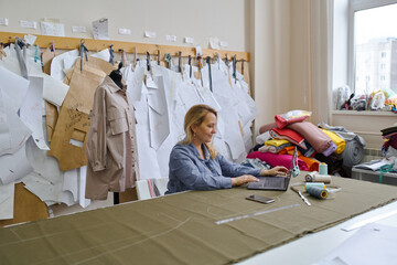 Happiness at work: smiling fashion designer in creative studio