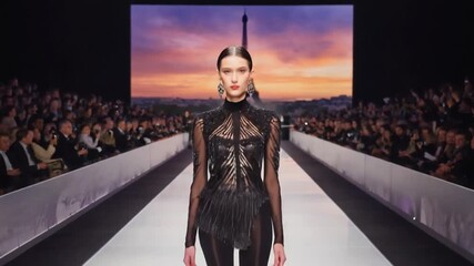Modern fashionable show runway. Audience admire model walk. Bright spotlights over scene. High-fashion style, design week. Stylish catwalk collection. Designers clothing, trendy look. Beautiful defile