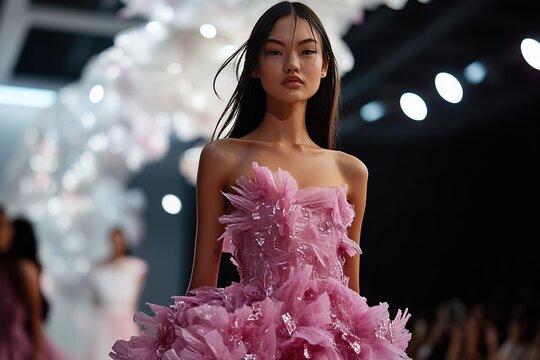 Striking fashion runway show featuring models in stunning outfits illuminated by dramatic lighting and surrounded by captivated audience in a chic venue
