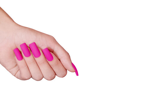 Female hand with pink nail design. Mate pink nail polish manicure. Female model hand with perfect pink manicure on transparent background. PNG file. Copy space. Place for text.