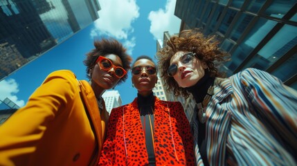 Three fashionable women in bold outfits posing in an urban setting