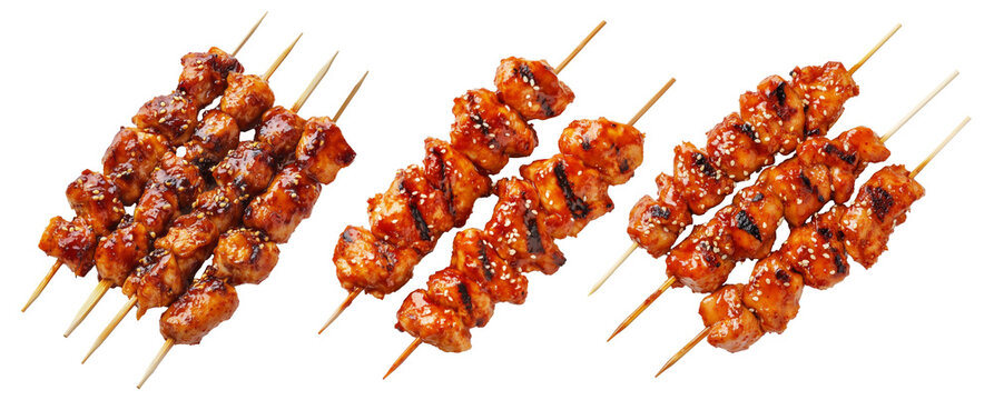 Grilled Korean Dakkochi chicken skewers coated in glossy sesame glaze,isolated on white background, Asian cuisine