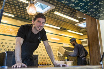 Fast Food Vendor Smiling Behind the Counter