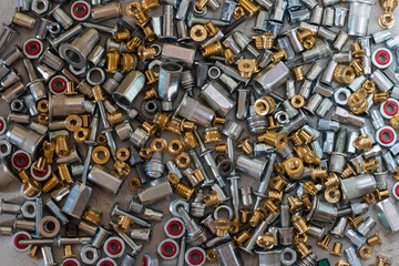 Metal bolts, nuts, and washers. Fasteners equipment. Hardware tools. Different types of nuts, bolts, and screws on table in workshop. Mechanic tools. Threaded fastener use in automotive engineering.