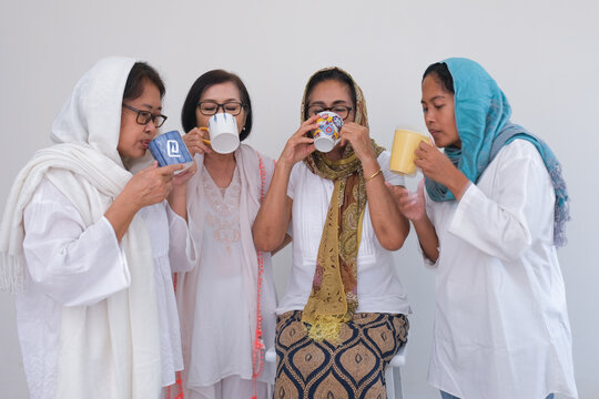 Group of moslem women standing together drinking to break their fast in Ramadan month