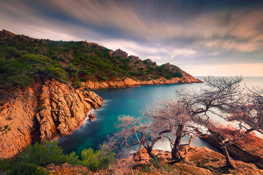 Vue générale sur la clanque de Méjean et son eau turquoise, au coucher du soleil avec en premier plan des arbres morts
