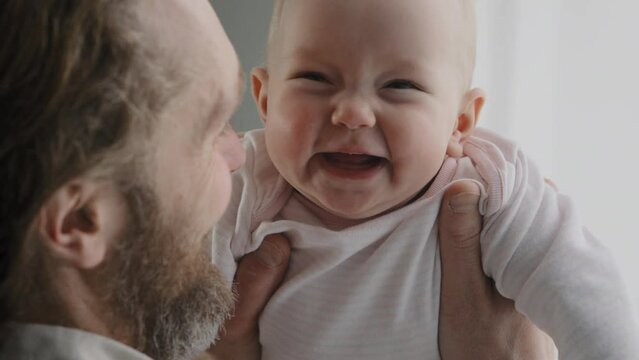 Middle age Caucasian father trying to calm down newborn baby. Man parent holding rocking a child on his hands. Authentic lifestyle family moment. Single dad home life concept.