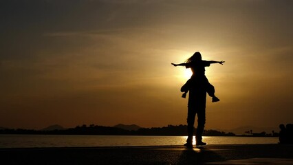 Silhouette of father keep child on shoulders. A father keep his daughter on shoulders silhouette and enjoy the sunset view on the beach.