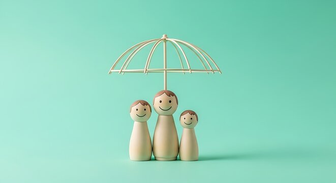 Smiling wooden family figures sheltered by an umbrella. A conceptual metaphor for life insurance, financial protection, and family security