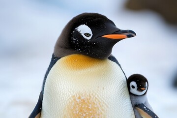 A father and son penguin duo standing together in the snowy landscape