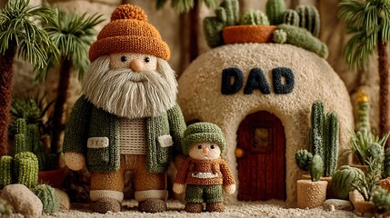 Knitted gnome father and son in front of a cozy cave house Keywords: gnome, father, son, family
