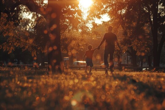 father and son navigate the winding paths together at fatherhood. father and son promenade. father and son in fatherhood. fatherhood of father and son cycling at sunlit park. Cycling duo