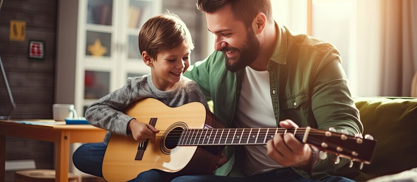 Father teaching son guitar during learning development month