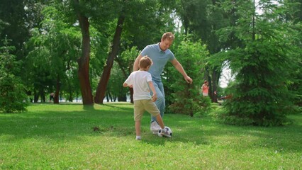 Happy father teaching son play soccer. Cheerful boy passing ball to dad on lawn.