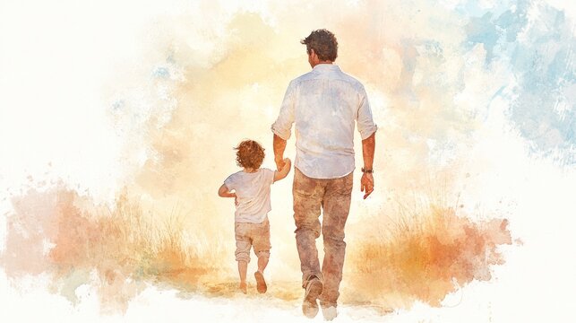 Fathers' Day card with cute watercolor sketch illustration of dad with son standing together, copy space for poster or social media. High quality