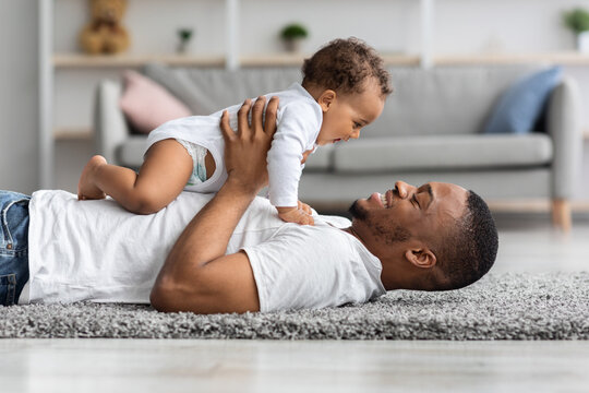 Father's Love. Happy Young Black Dad Bonding With Newborn Baby At Home