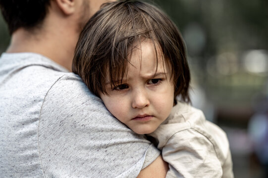 the boy is sad on his dad's shoulder. The father comforts the crying son. The concept of fatherhood