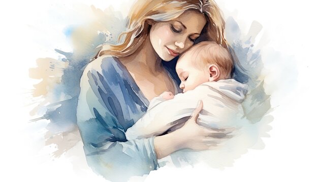 A mother holds her child with care and love. The baby is in her mother's arms. The concept of motherhood and family. Rear view. Imitation of watercolor