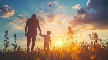 Silhouette of father holding his child's hand walking into the sunset. Fatherhood, parenting concept