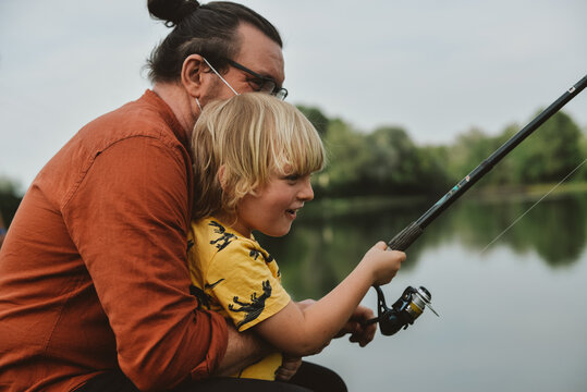 Father holding little toddler boy playing, having fun during warm spring day. Father's day concept.