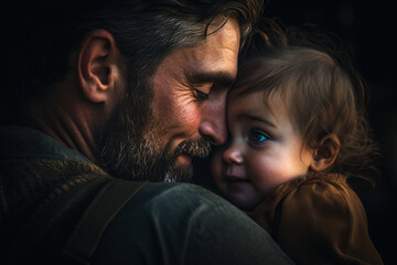 A bearded father embracing and hugging his child, fatherly love, generative AI illustration