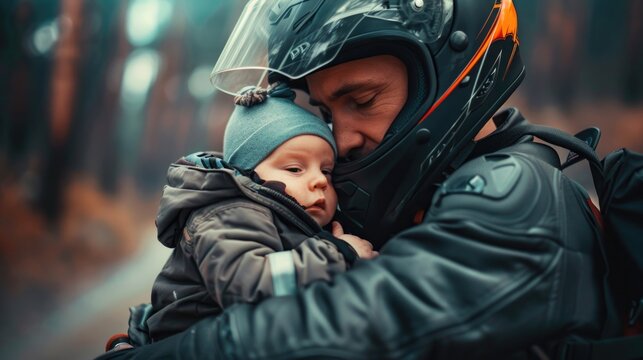 A man holding a baby wearing a helmet, suitable for safety concept