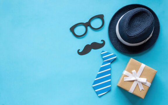 Father's Day concept with gifts, glasses, hat, tie, and mustache on a blue background.