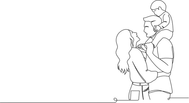 Father carrying son on shoulders with arm raised pose action line art vector illustration. One line drawing and continuous style