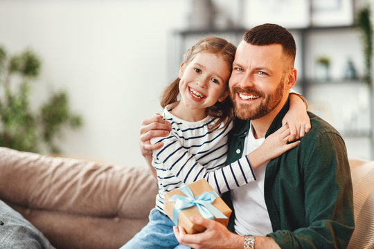 Cute girl hugging happy father with gift.