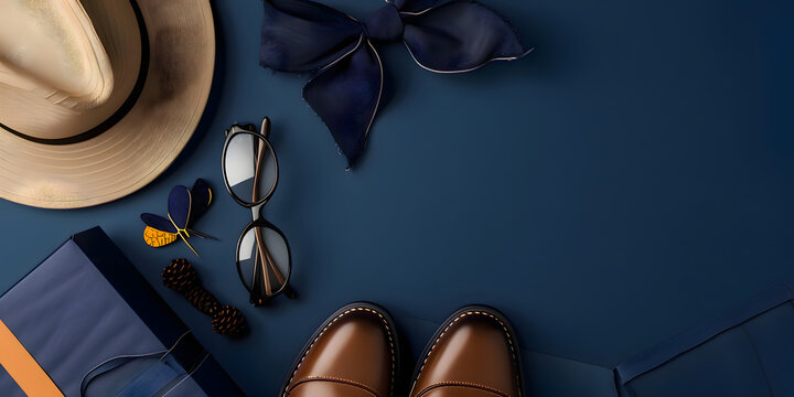 Happy Fathers Day flat lay composition with gift box, necktie, eyeglasses on blue table. Top view.
