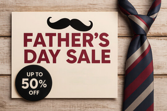 Fathers Day Sale Advertisement with Mustache Graphic and Tie on Wood Background