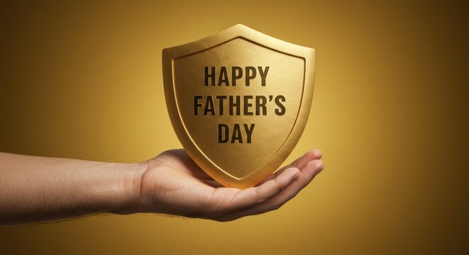 Hand holding a shield with happy father's day text on a gold background.