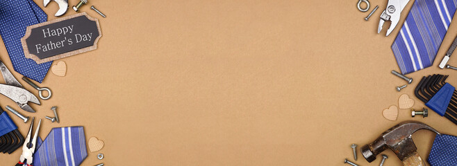 Happy Fathers Day gift tag with double border of ties and tools on a brown paper banner background. Top down view with copy space.