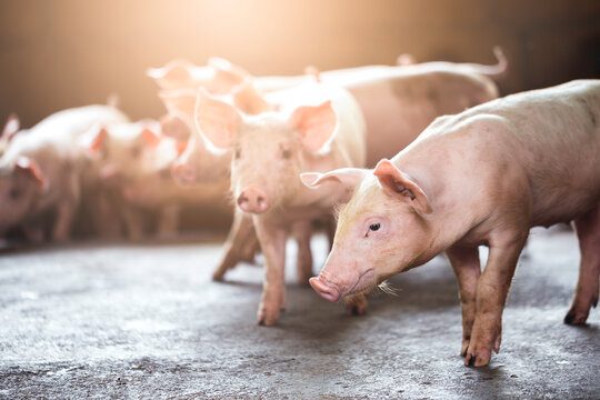 Fattening pigs on a large commercial pig farm are curiously looking at the cameras. These cute pigs on the pig farm add life to the vibrant atmosphere of pig farming practices.