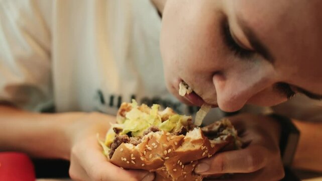 Close-up of a young woman taking a big bite of a sesame seed beef burger in a fast food restaurant. Her expression shows enjoyment and focus on the meal. Concept of fatty and unhealthy food