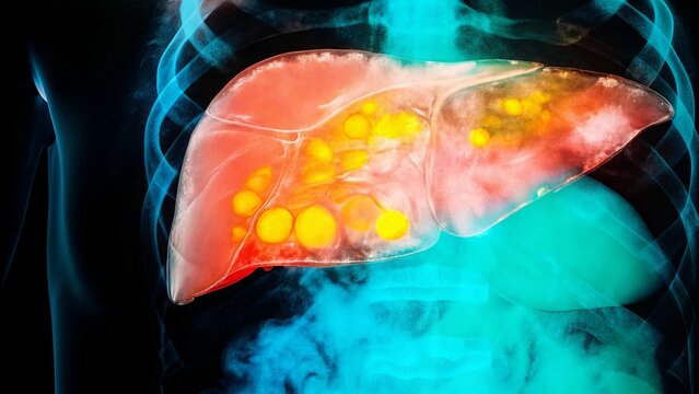Anatomical illustration of a liver with fatty deposits for medical education.
