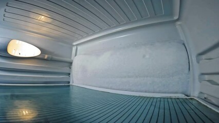 Broken refrigerator with snow inside need repairing. Icing on the back wall of the refrigerator. Freezer repaired in a service workshop. Fridge Inside view. Repair of faulty refrigeration equipment