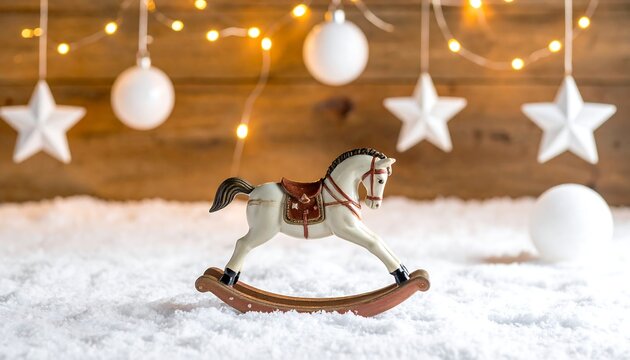 Festive scene of gold ornaments, garland, and lights on snowy faux fur
