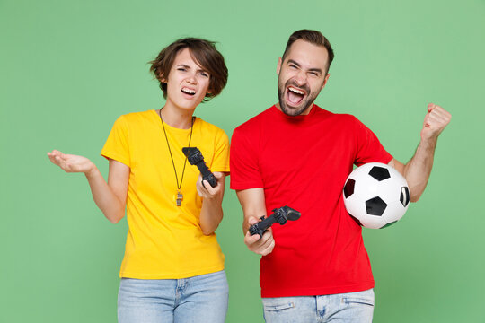 Displeased happy couple friends sport family woman man football fans in t-shirts cheer up support favorite team with soccer ball play pc game with joystick console isolated on green background studio.