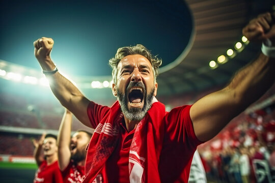 Excited man roots for favorite team watching soccer game. Emotional male person with remote control in hand feels happy for goal on Championship