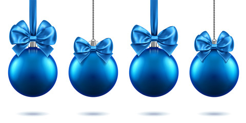 2019 christmas or new year realistic toys with bows hanging on chains. Merry christmas fir tree decorations, blue baubles with bow-knots, blue spheres for xmas holidays. Celebration theme